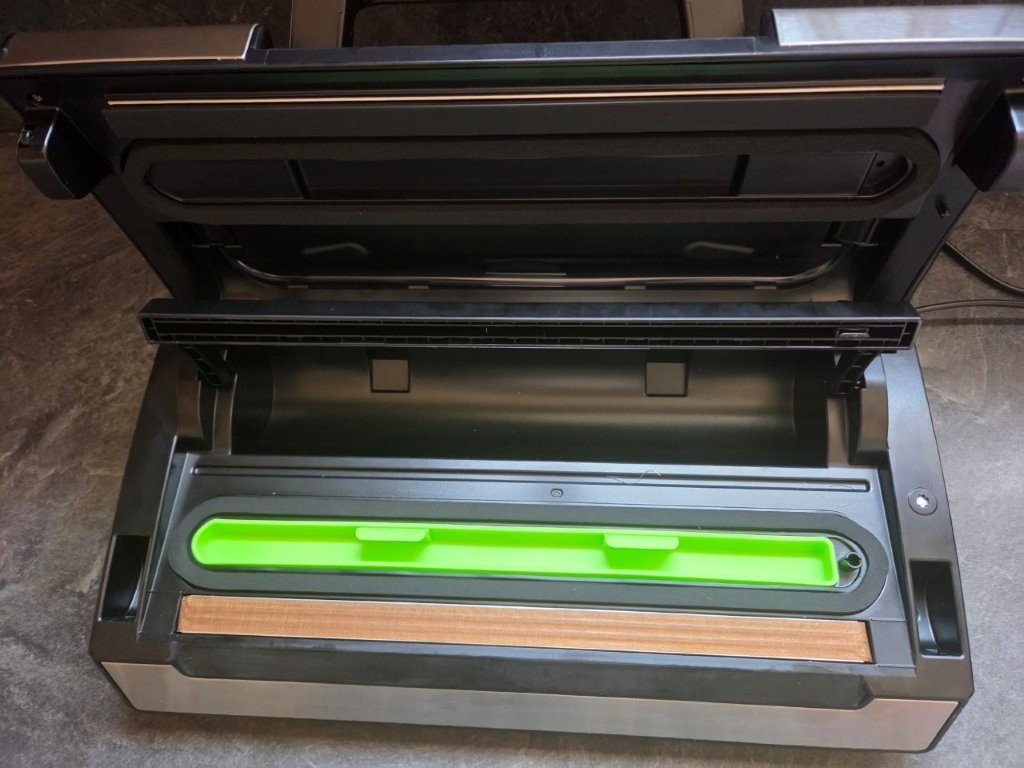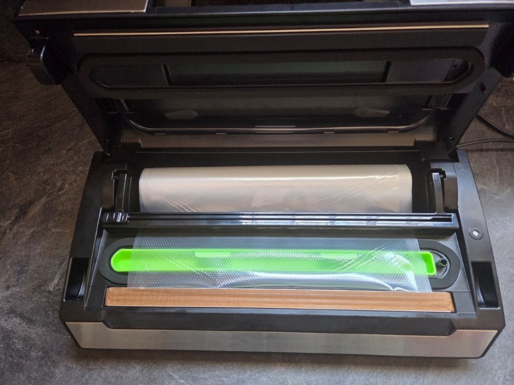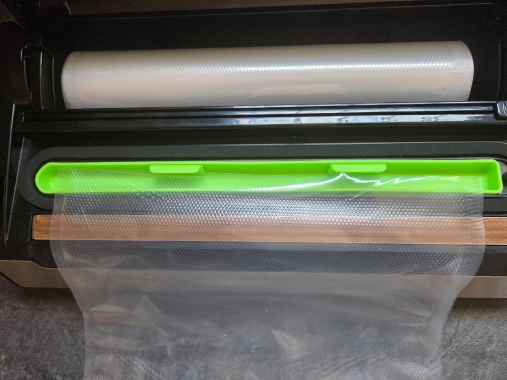 The machine's cutter allows you to cleanly cut and reuse the bag.